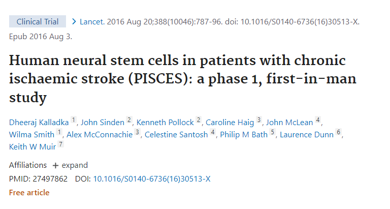 一項關于神經(jīng)干細胞移植治療中風患者的為期兩年的開放標簽、單中心和劑量遞增臨床試驗(NCT01151124)已經(jīng)完成。臨床數(shù)據(jù)分析表明,高達2000萬個細胞的單次腦內(nèi)神經(jīng)干細胞劑量不會引起不良事件,并且與神經(jīng)功能改善有關。