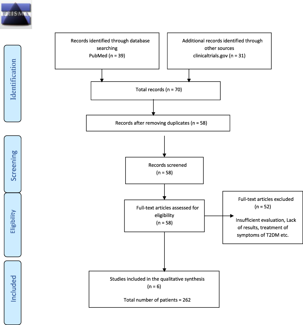 總共收集了70個試驗;檢查重復記錄后只剩下58人。在58項臨床試驗中,僅包括六項研究(T1、T2、T3、T4、T5、T6)(表1)。其余的需要更全面的結果,關于治療評估方法的信息不足,旨在報告與T2DM相關的長期合并癥而不是疾病的治療,非隨機化,參與者有其他病態。薈萃分析中包含的研究均使用自體 MSCs注射,無論其來源如何。
