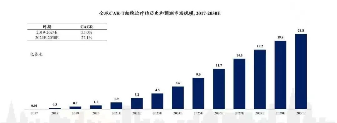 細胞與基因治療(Cell?&?Gene?Therapy,CGT)是當前生物醫(yī)藥領域最火熱的賽道之一,免疫細胞治療、干細胞治療、基因治療相關的進展可謂是日新月異。CAR-T療法作為近幾年抗癌療法的寵兒,短短十余年的探索,其有效性陸續(xù)得到驗證,從臨床研發(fā)走向商業(yè)化。根據(jù)沙利文分析,預測全球在2030年CAR-T療法的市場規(guī)模將達到218億美元。