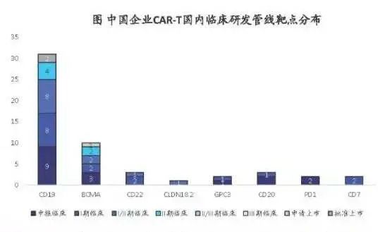 目前中國企業(yè)在國內開展的CAR-T臨床管線主要集中于CD19與BCMA,也有一些公司在新靶點上做出突破,如科濟藥業(yè)在CLDN18.2的胃癌實體瘤中展現(xiàn)CAR-T療法的初步療效。