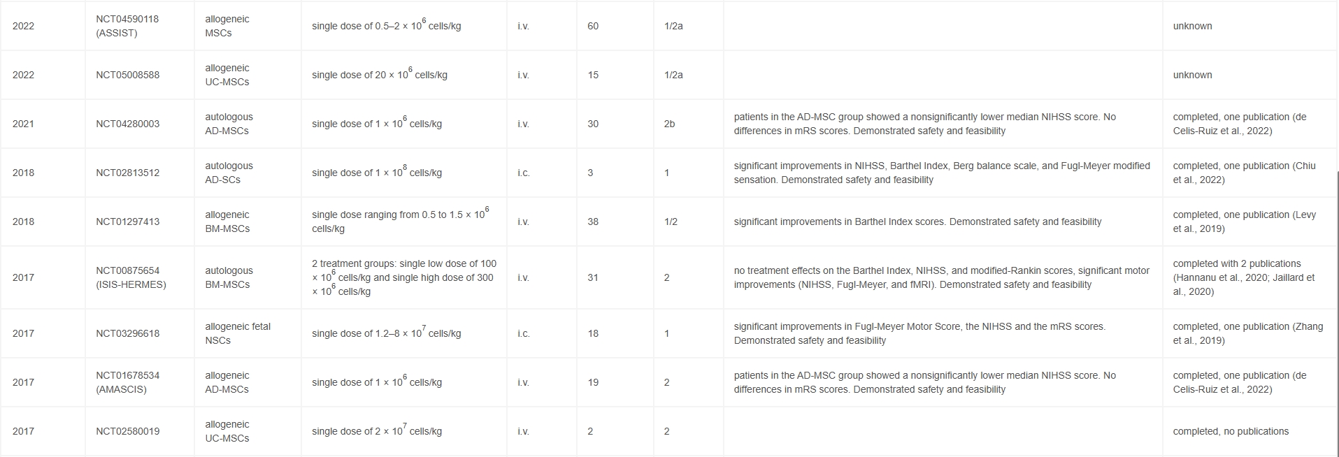 結(jié)果表明:綜上所述,AMASCIS IIa期先導(dǎo)臨床試驗(yàn)結(jié)果提示,在缺血性卒中發(fā)作后的前2周內(nèi)靜脈注射AD-MSCs,在24個(gè)月的隨訪中是安全的。盡管各治療組間的療效終點(diǎn)均未達(dá)到統(tǒng)計(jì)學(xué)顯著水平,但與安慰劑組相比,AD-MSC治療組的NIHSS評(píng)分呈現(xiàn)改善趨勢。
