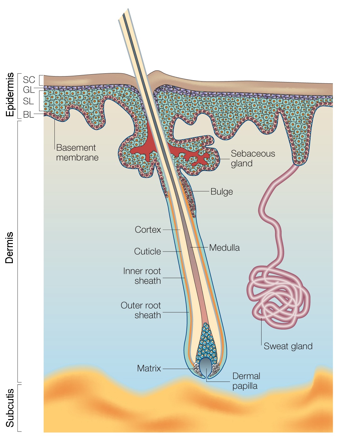 Skin structure diagram adapted by permission from Macmillan Publishers Ltd: Nature Reviews Genetics 3, 199-209 (March 2002), Getting under the skin of epidermal morphogenesis, Elaine Fuchs & Srikala Raghavan; doi:10.1038/nrg758; Copyright 2002.