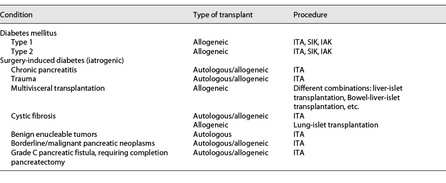 如今,胰島移植可被視為與β細胞功能喪失相關的多種病癥的一種治療選擇(表1)。該程序可以作為單獨胰島移植 (ITA) 在非尿毒癥受試者中進行,這是一種通常用于治療醫(yī)源性(手術引起的)糖尿病和1型糖尿病的非尿毒癥患者的選擇。