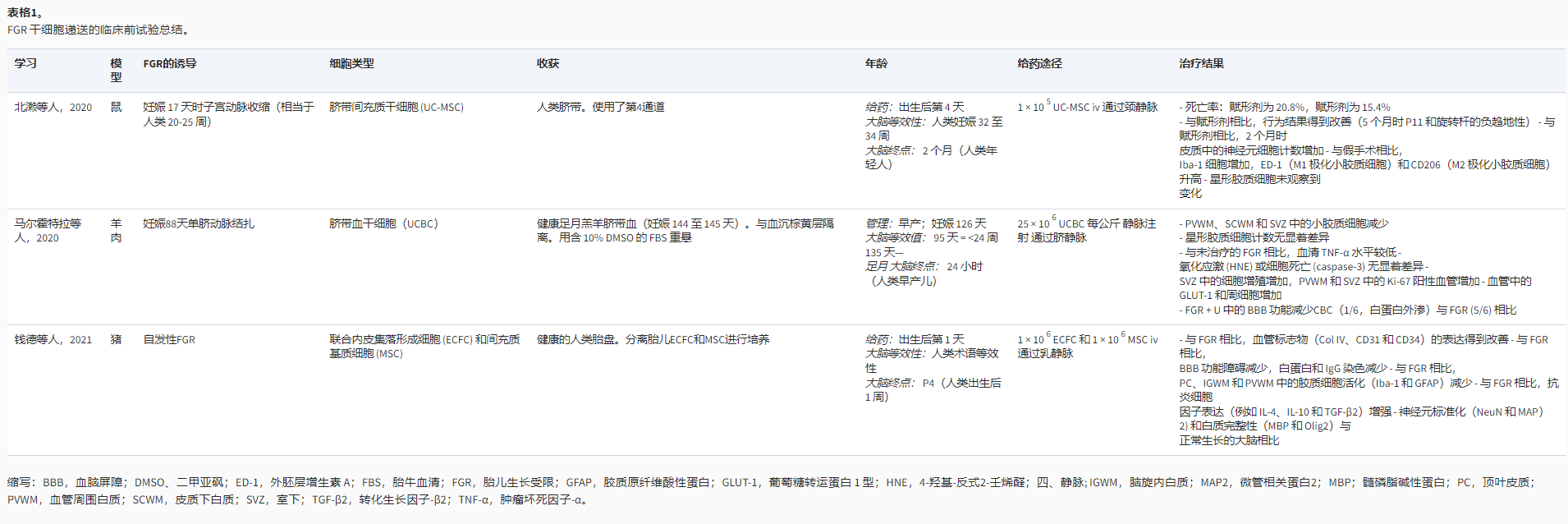 除了缺乏FGR嬰兒的臨床試驗外,臨床前動物模型研究也有限,迄今為止發表的研究僅有3篇(表1)。這些研究,包括FGR大鼠模型和2項大型動物研究,顯示出有希望的神經保護結果,報告了大腦干細胞治療后的多區室益處。