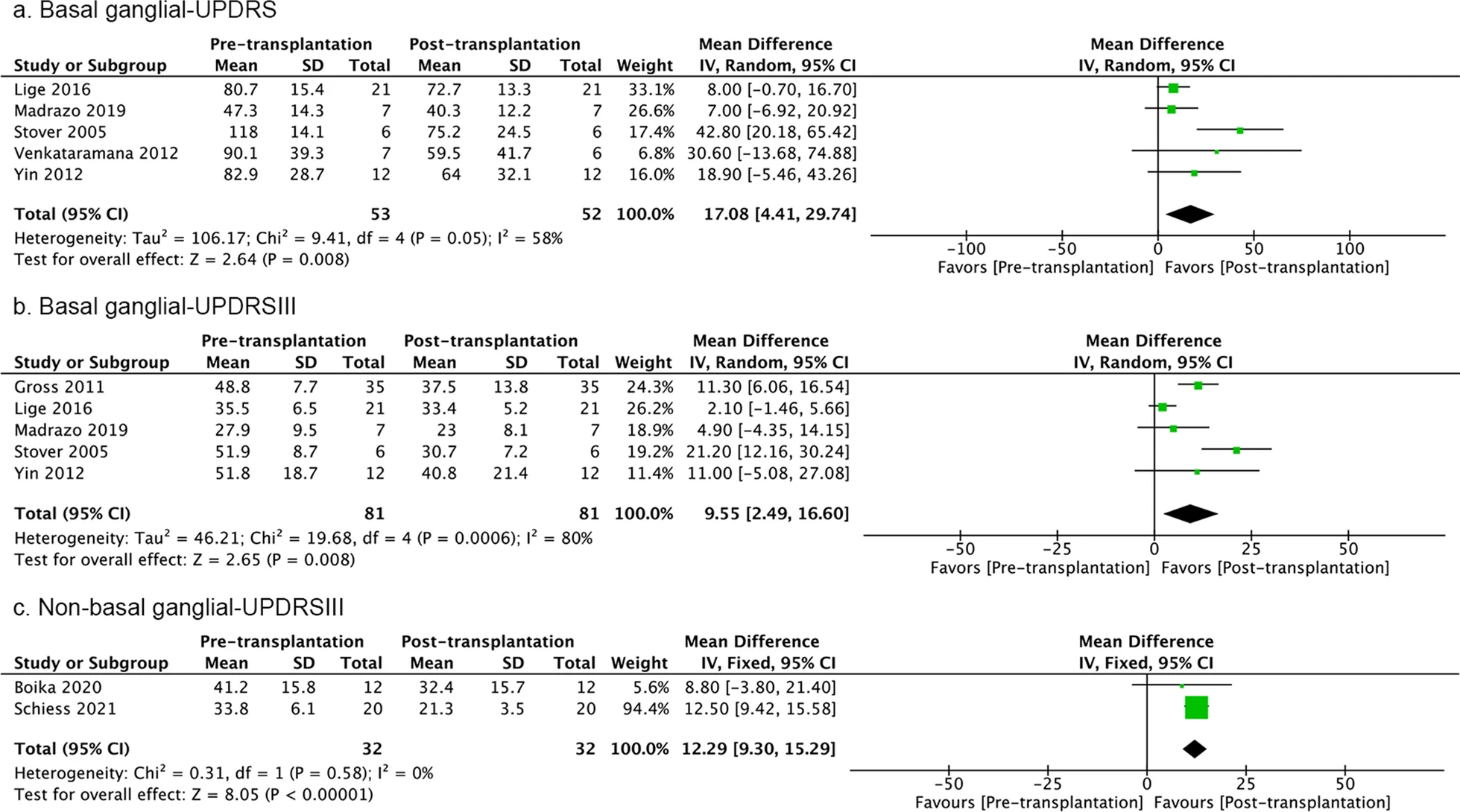 我們系統地識別了2023年7月之前發表的所有研究干細胞移植治療帕金森病的臨床試驗。其中,報告同質細胞(包含一種細胞類型)移植的研究被納入薈萃分析。分析細胞治療前后定量神經系統評分的平均差或標準化平均差,以評估治療效果。