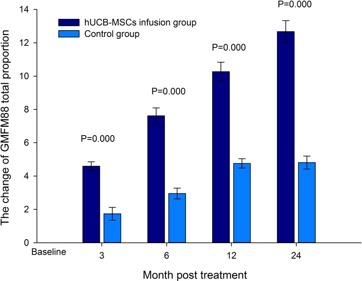 兩組之間的基線功能評估(包括GMFM-88量表分數和CFA分數)沒有觀察到顯著差異。輸注hUCB-MSC后相對于基線狀態的改善在輸注組中顯著高于對照組
