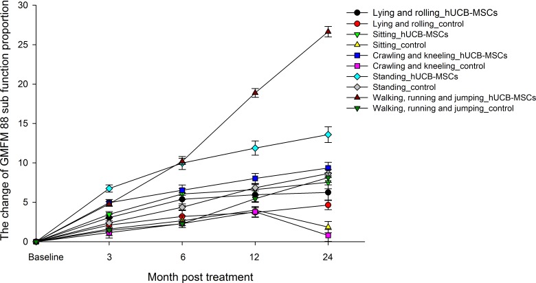 關于GMFM-88分數的每個功能的比例,基線水平的變化設置為零。在輸注hUCB-MSC后3個月,所有5個功能區域的GMFM-88評分呈上升趨勢(圖2)。治療后24個月,對照組的坐、爬和跪功能沒有顯著改善,但其他區域的比例變化有所增加(圖2)。