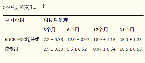 基線水平的CFA總分在hUCB-MSC輸注組中為66.04±1.48,在對照組中為65.70±1.37。組間未觀察到顯著差異。CFA總分變化評估(表3)。