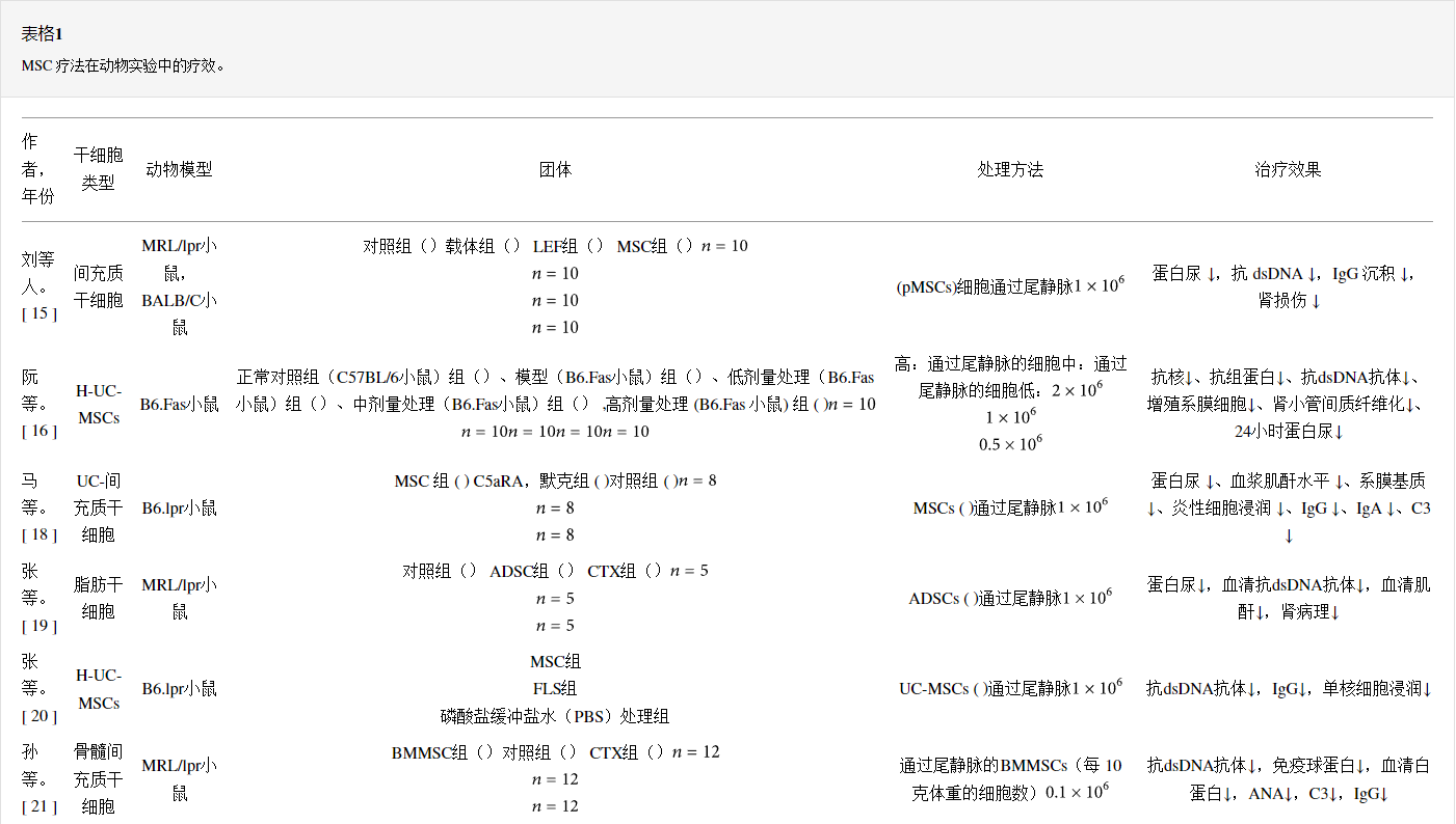 近年來在動物實驗中評估了MSC療法的療效(表1)。