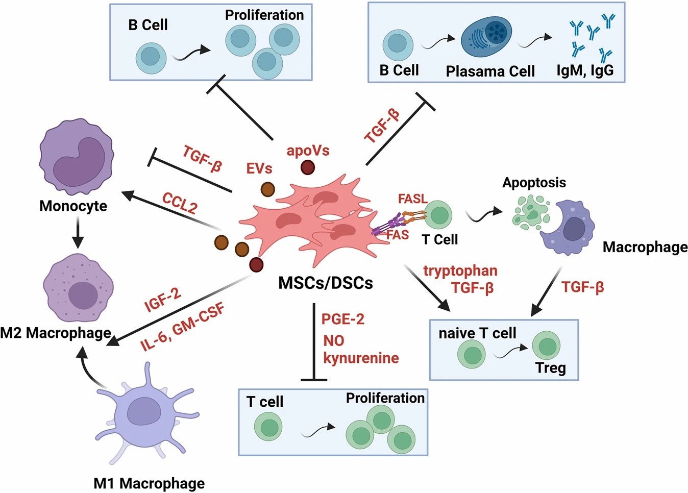 - 免疫調節功能:間充質干細胞不表達主要組織相容性復合體(MHC)II類分子,因此具有低免疫原性,可以抑制T淋巴細胞、B淋巴細胞和自然殺傷細胞的增殖反應,從而減少免疫排斥反應。這一特性使得間充質干細胞在異體甚至異種移植中具有優勢。