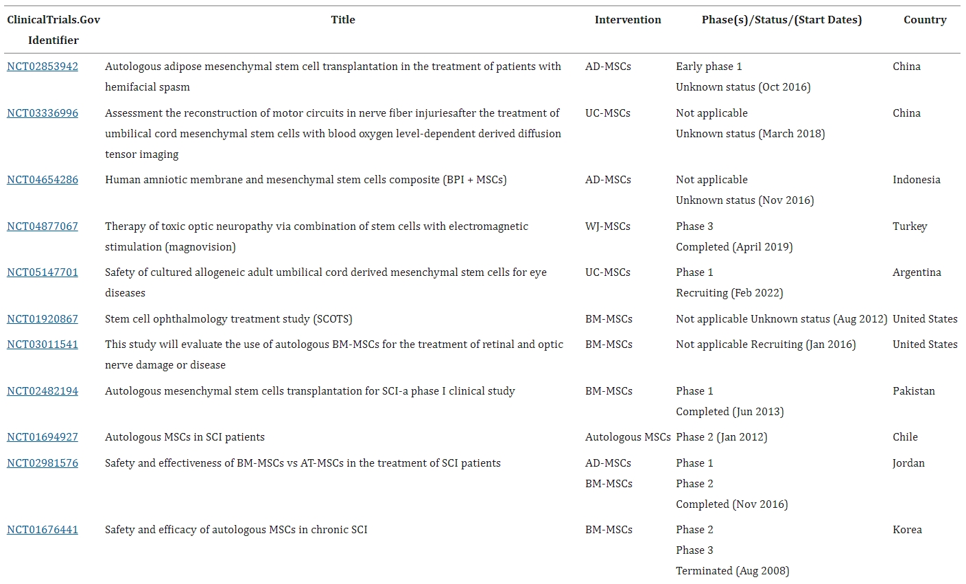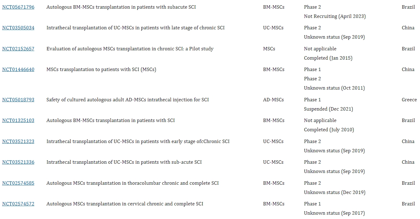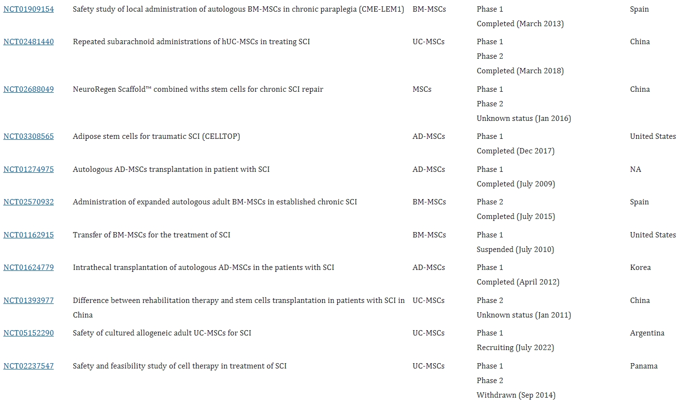 - 骨髓間充質干細胞(BM-MSC):2008年Geffner等人臨床試驗(NCT01909154)證明,多種途徑給予BM-MSC對多種脊髓損傷安全可行,可改善患者生活質量。