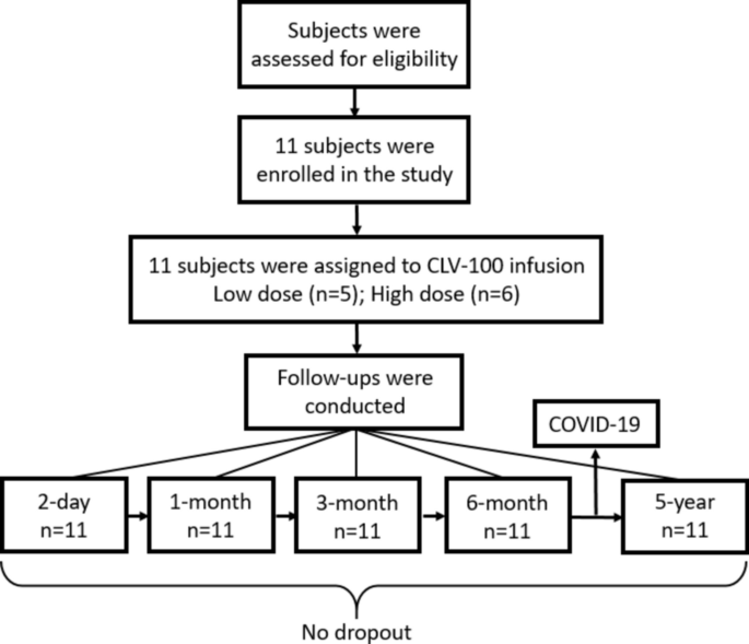 臨床測量指標(biāo):主要結(jié)局指標(biāo)為確定CLV-100輸注的中期安全性(臨床和亞臨床結(jié)局),重點(diǎn)關(guān)注死亡、住院、相關(guān)不良事件和癌癥。次要結(jié)局指標(biāo)包括基于亞臨床血清炎癥細(xì)胞因子評估的免疫調(diào)節(jié)作用。