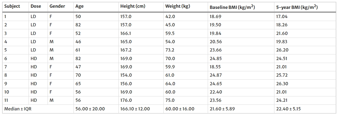 受試者的隨訪特征:所有11名健康志愿者(包括4名男性和7名女性)同意參加后續(xù)研究。其中,5名之前接受過低劑量 (LD) 的 CLV-100(6500萬個細(xì)胞),6名接受過高劑量 (HD) 的CLV-100(1.3億個細(xì)胞)(圖1)。在此次五年隨訪中,受試者的中位年齡為56±20歲,體質(zhì)指數(shù) (BMI) 為22.40±5.15kg/m2(表1)。人體測量數(shù)據(jù)顯示所有受試者均保持功能獨(dú)立、身體活躍和健康(表1)。值得注意的是,只有三名受試者略微超重,BMI>25kg/m2,兩名受試者從正常BMI轉(zhuǎn)為略微體重不足。