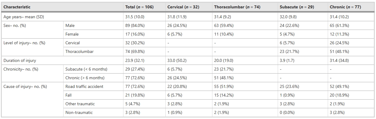 參與者平均年齡為31.5±10.0歲,其中大多數為男性(n=89,84.0%)。就損傷平面而言,32名(39.2%)患者患有頸椎SCI,74名(69.8%)患者患有胸腰椎SCI。共有77名患者患有慢性SCI(72.6%),29名(27.4%)患者患有亞急性SCI。表1列出了患者的基線人口統計學和臨床特征 。
