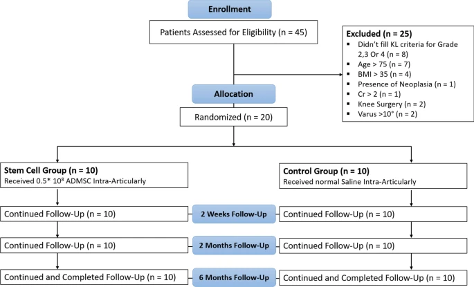 方法:這項三盲介入性臨床試驗納入了20例符合美國風濕病學會 (ACR) 標準的特發性膝關節骨關節炎 (OA) 患者。患者被隨機分配接受關節內注射0.5×108個同種異體ADMSC或生理鹽水(對照組)。