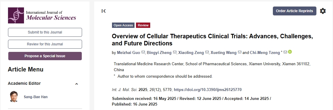 [1]Guo, M.; Zheng, B.; Zeng, X.; Wang, X.; Tzeng, C.-M. Overview of Cellular Therapeutics Clinical Trials: Advances, Challenges, and Future Directions. Int. J. Mol. Sci. 2025, 26, 5770. https://doi.org/10.3390/ijms26125770