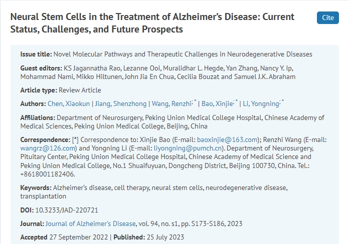 2023年7月,來自中國醫學科學院北京協和醫學院在《阿爾茨海默病雜志》(Journal of Alzheimer’s Disease)上發表了一篇“Neural Stem Cells in the Treatment of Alzheimer’s Disease: Current Status, Challenges, and Future Prospects”的綜述。