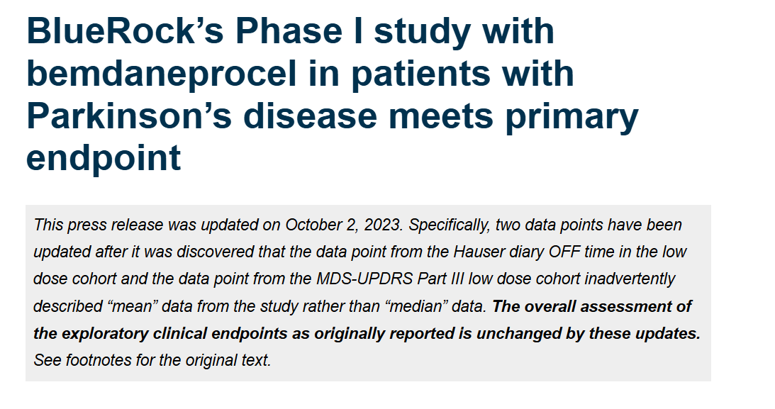 2023年10月2日,拜耳公司子公司 BlueRock Therapeutics LP 今天公布了 bemdaneprocel (BRT-DA01) I 期臨床試驗的積極數據詳情,bemdaneprocel 是一種用于治療帕金森病的干細胞衍生試驗療法。