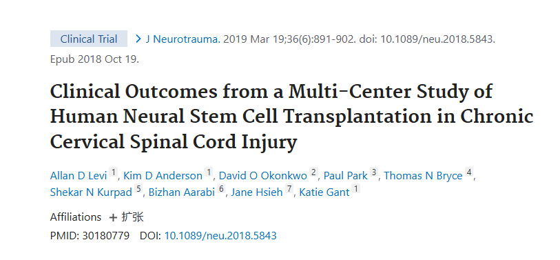 2019年3月19日,邁阿密大學(xué)米勒醫(yī)學(xué)院在國(guó)際期刊《Journal of Neurotrauma》上發(fā)布了一篇《人類神經(jīng)干細(xì)胞移植治療慢性頸脊髓損傷的多中心研究的臨床結(jié)果》的研究結(jié)果。