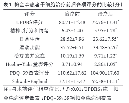 MDS-UPDRS:21例患者均成功移植,出院后隨訪6~49月,平均24.9月。與術(shù)前基線水平相比,21例患者UPDRS評分、Hoehn-Yahr評分、PDO-39評分明顯降低。UPDRS四個分項,即精神、行為和情緒、日常生活運動功能和治療的并發(fā)癥等評分也都明顯降低。