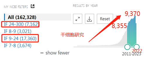 到2022年11月23日,干細胞研究領域已經發表了42萬篇PubMed收錄的論文,其中近10年就發表了23萬篇。干細胞研究成果15.1%發表在9分+期刊,4.4%發表在24分以上期刊。