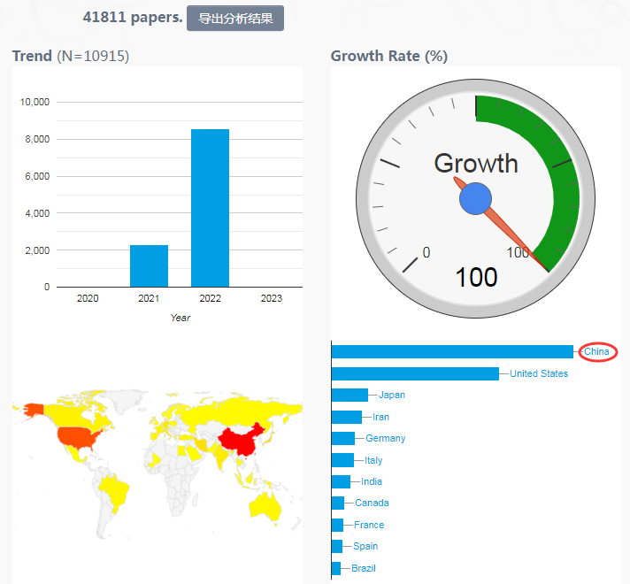 國家分布可以看到,中國發表的研究論文數量為3,727篇,占34.1%,居第一位。