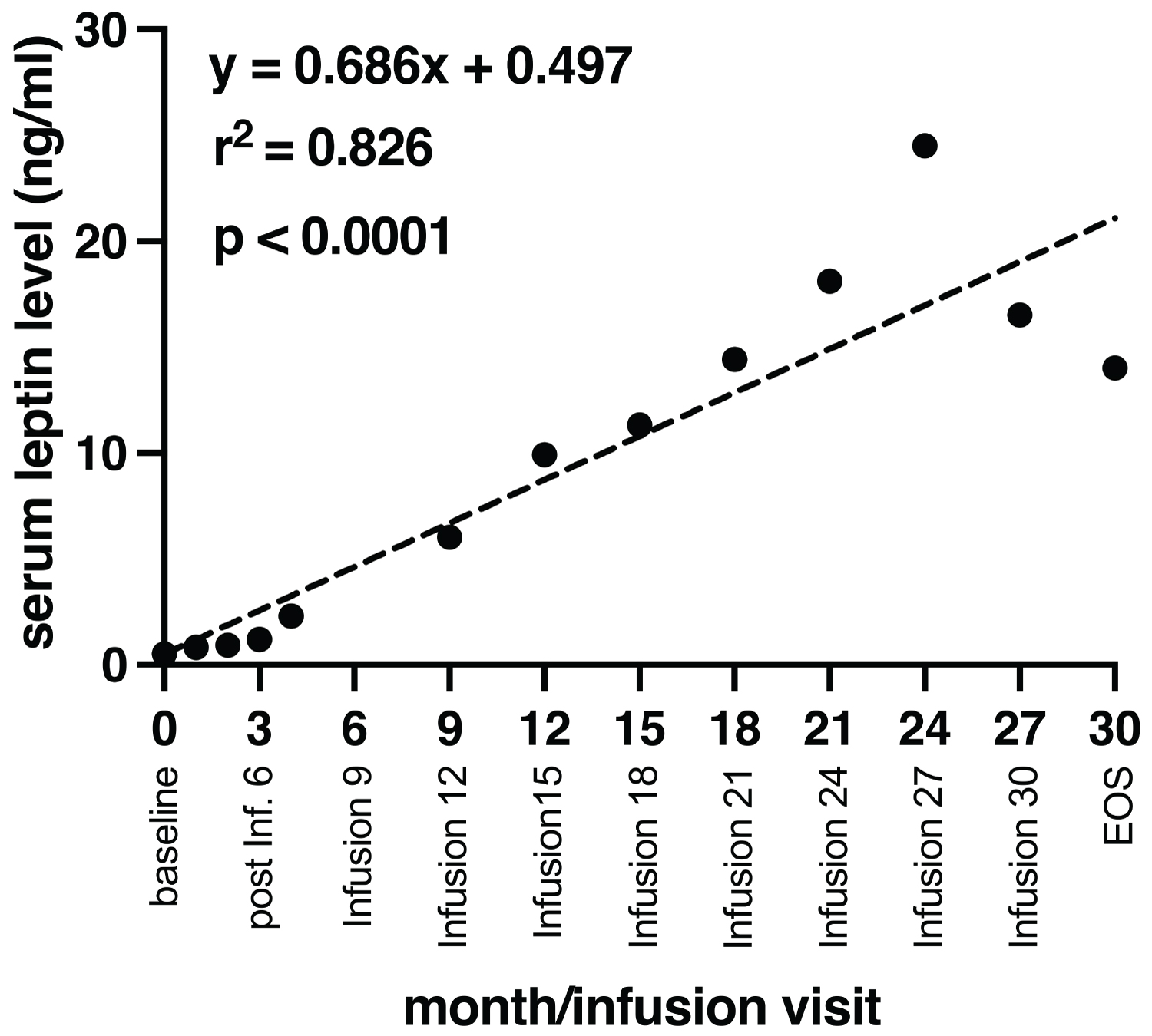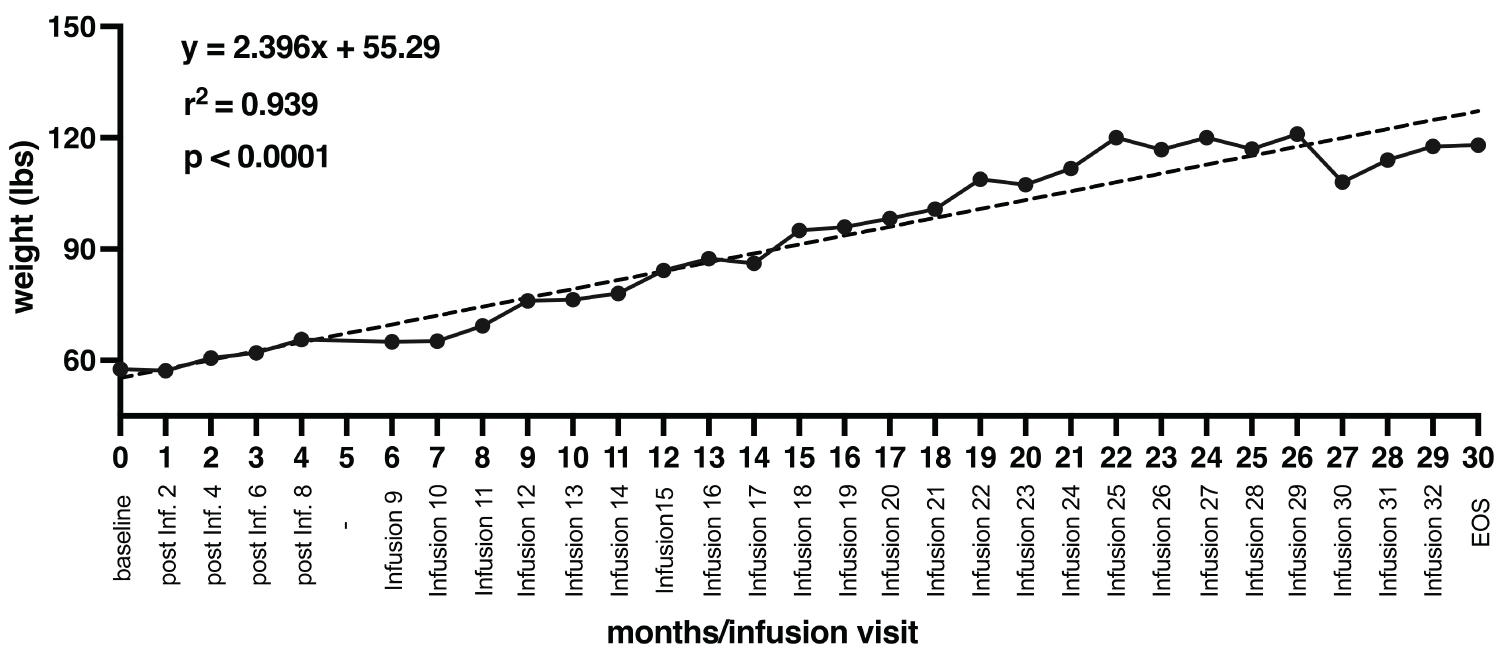 (在30個月的過程中總共進行了32次輸注)。黑色虛線表示簡單線性回歸分析,顯示患者體重變化與輸液次數之間存在統計學顯著正相關。