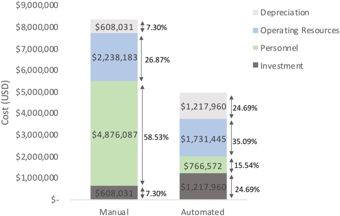 幸運的是,對AI方法、自動化技術、3D 培養條件和技術進步的經濟評估已經顯示出可觀的預期節省。經濟分析表明,盡管前期成本較高,但在生成和維護 iPSC 系時,與手動技術相比,自動化系統在機器預期的 8 年使用壽命內總體可節省 42%(圖3)。