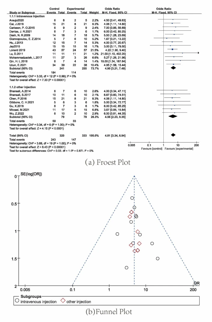 數據顯示:靜脈注射組(實驗事件241例,對照255例)OR值為4.90,其他注射組(實驗事件79例,對照78例)OR值為4.56,表明兩種策略療效相近,無論靜脈或肌肉/肘前靜脈注射,MSCs均能顯著改善糖尿病(圖9)。