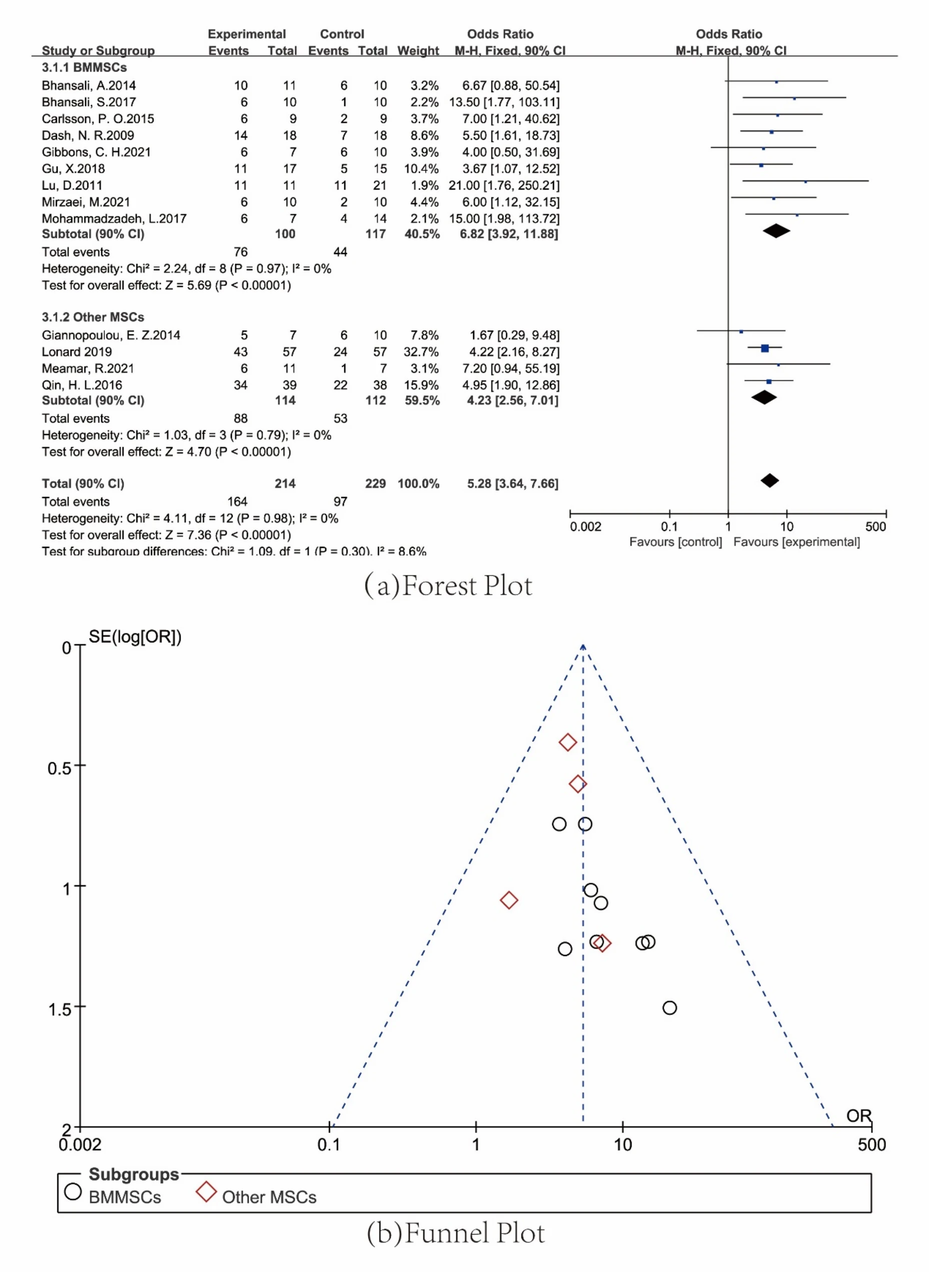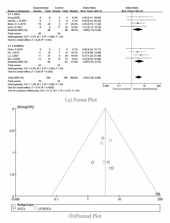 自體MSCs亞型的療效與特性對比:自體間充質干細胞(MSCs)中,骨髓源性MSCs(BMMSCs)在糖尿病治療中表現最優,其薈萃分析OR值達6.82(實驗組100例vs對照組117例),顯著高于其他來源MSCs(OR=4.23),這表明BMMSC在糖尿病治療中具有更重要的作用(圖6ab)。