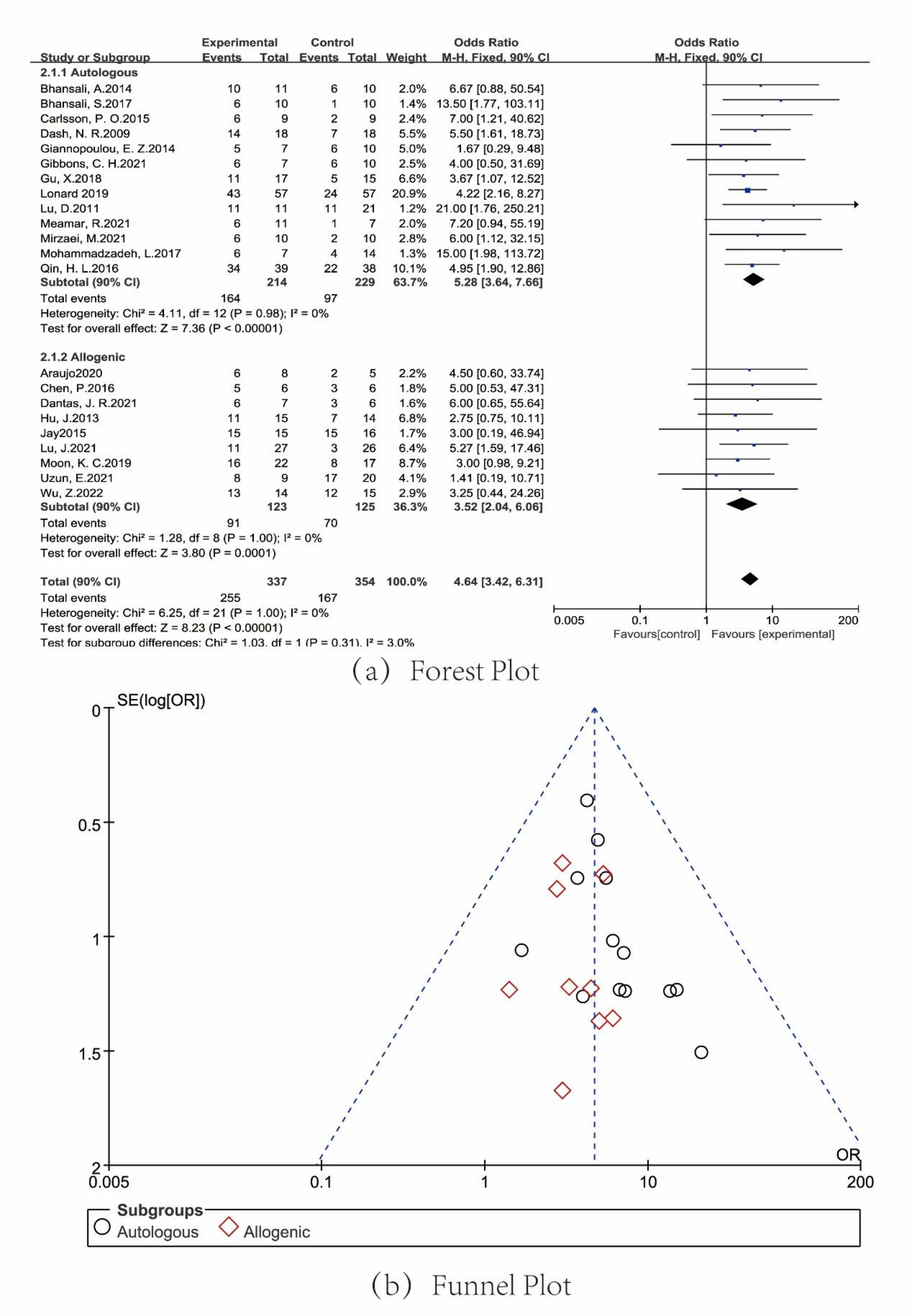 自體干細胞來源包括骨髓、臍帶、脂肪和胎盤。在確保自體MSCs療效優于同種異體MSCs后,進一步分析了BMMSCs和其他MSCs兩大類。