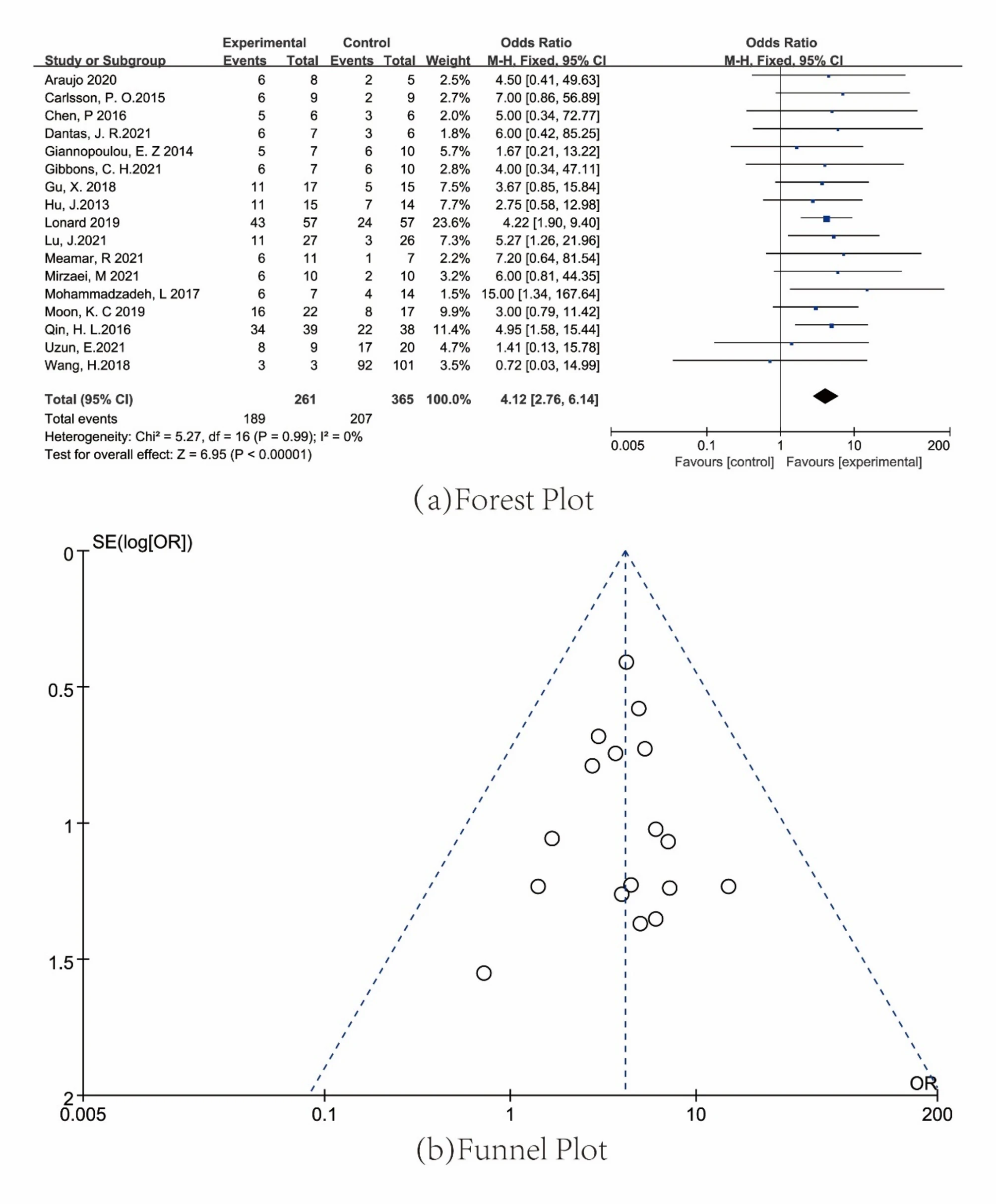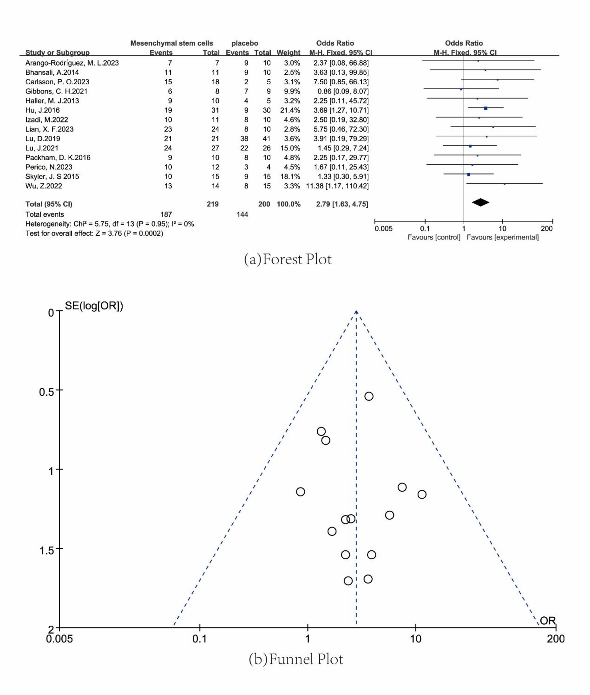 森林圖顯示所有研究數據右偏,漏斗圖證實結果可靠性,表明MSCs在臨床應用中安全性更佳(圖2)。