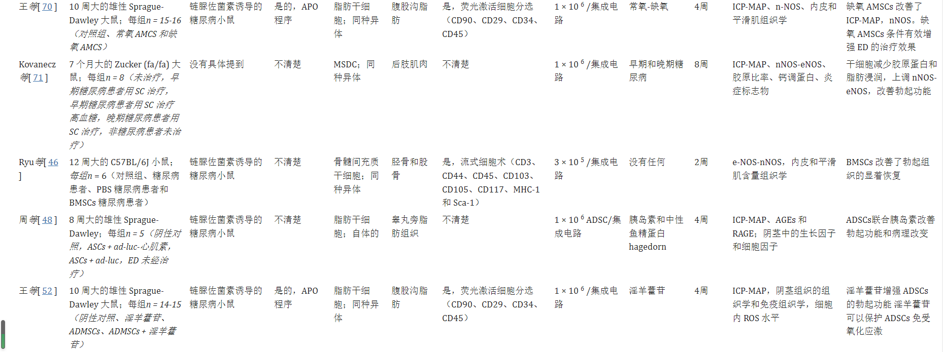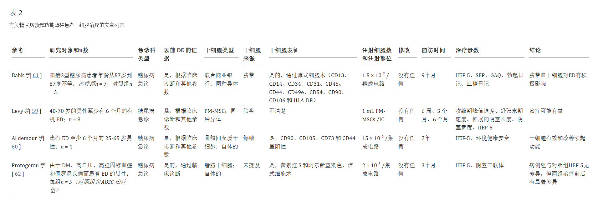 2019年,Protogerou等人報(bào)道了一種不同的方法,即使用自體脂肪干細(xì)胞治療5名DM患者的ED。將該組與其他五個(gè)接受血小板裂解物的人進(jìn)行了比較。給予的干細(xì)胞數(shù)量為2×105個(gè)細(xì)胞,持續(xù)3個(gè)月。在研究結(jié)束時(shí),在治療組和對(duì)照組之間沒有觀察到IIEF-5的差異。然而,兩組在治療前后均觀察到顯著改善。
