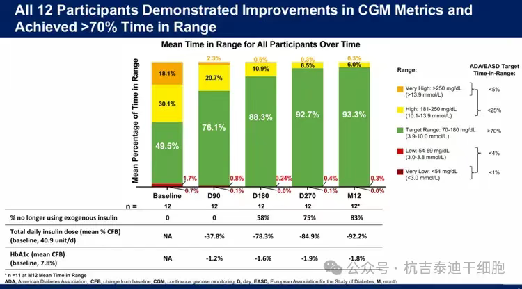 在針對嚴重1型糖尿病伴低血糖無知覺患者的試驗中,83%(10/12)的患者一年內完全停用胰島素,所有患者HbA1c降至正常(<7%)、血糖達標時間(TIR)超93%,且嚴重低血糖事件從第90天起清零,首次實現接近“功能性治愈”的療效。