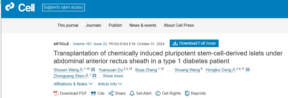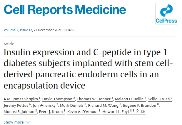 該試驗評估了在腹部前直肌鞘下自體移植化學誘導的多能干細胞來源的胰島 (CiPSC 胰島) 治療1型糖尿病的可行性。患者在移植后75天開始實現(xiàn)持續(xù)的胰島素依賴。患者的血糖達到目標范圍時間從基線值的43.18%增加到移植后第4個月的96.21%,同時糖化血紅蛋白 (長期全身血糖水平處于非糖尿病水平的指標) 下降。