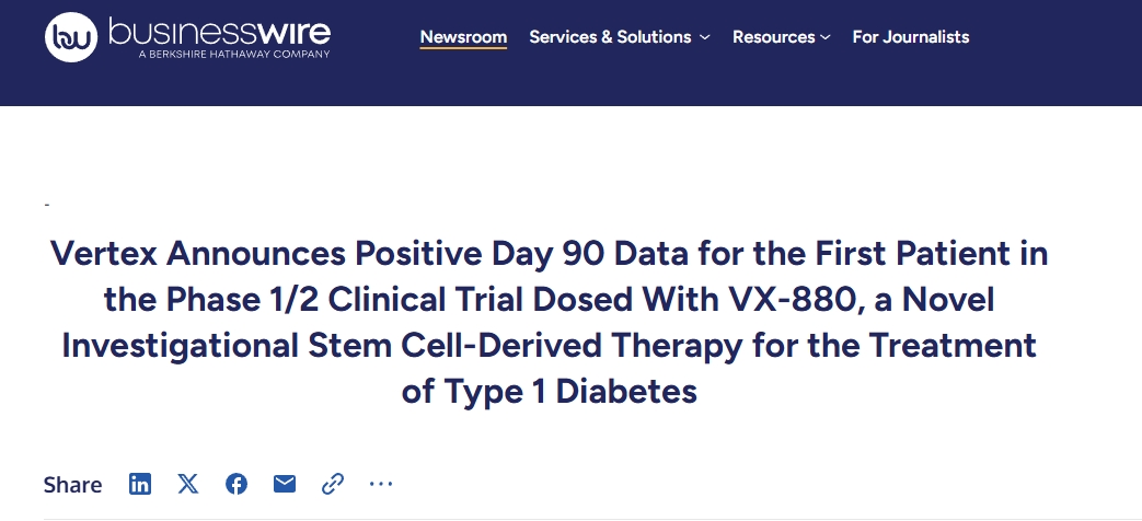 Vertex成熟細胞移植的優(yōu)勢:相比之下,Vertex Pharmaceuticals則采取了不同的策略,在針對 T1D患者的1/2期臨床試驗中,他們移植了完全分化的hES細胞衍生的胰島樣細胞 (VX-880)。