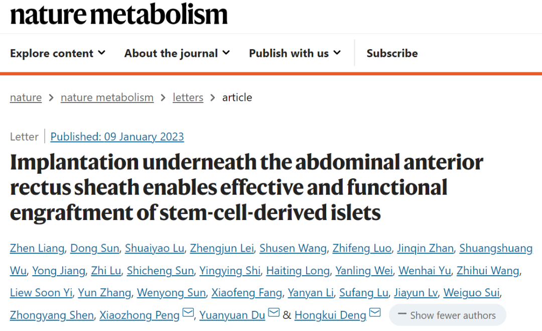 2023年1月9日,北京大學鄧宏魁研究組、中國醫學科學院/北京協和醫學院彭小忠研究組合作,在Nature Metabolism期刊發表一項題為:Implantation underneath the abdominal anterior rectus sheath enables effective and functional engraftment of stem cell-derived islets 的研究論文。