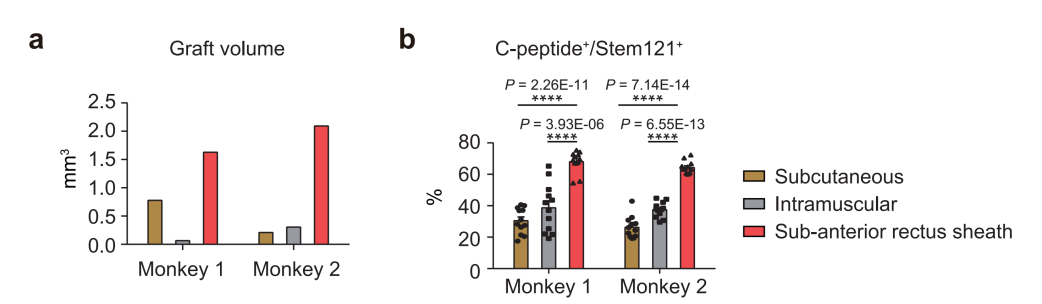 研究者將hCiPSC-islets輸注到糖尿病模型猴腹直肌前鞘下,所有接受移植的糖尿病猴的血糖控制都得到了顯著改善。