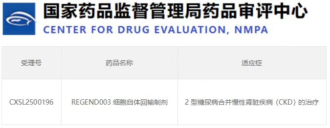 2025年5月,據(jù)國家藥品監(jiān)督管理局藥品審評中心官網(wǎng)公布一款名為“REGEND003”的腎干細胞自體回輸制劑近日獲得了《藥物臨床試驗批準通知書》的新藥注冊臨床試驗I/II期申請(受理號:CXSL2500196),用于治療2型糖尿病合并慢性腎臟疾病(CKD)。[19]