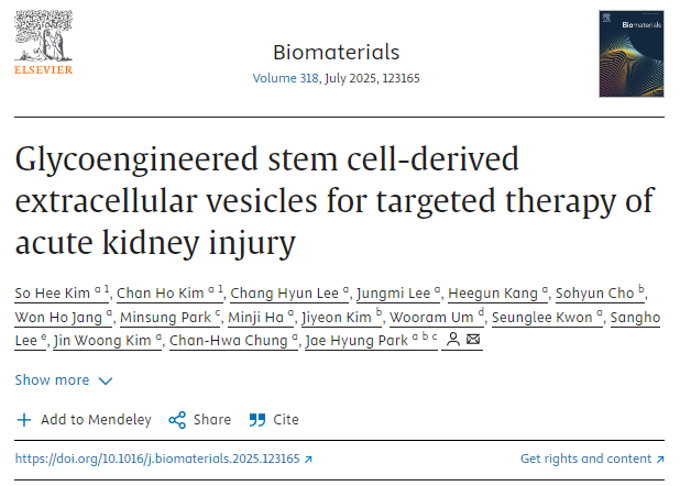 [2]So Hee Kim, Chan Ho Kim, Chang Hyun Lee, Jungmi Lee, Heegun Kang, Sohyun Cho, Won Ho Jang, Minsung Park, Minji Ha, Jiyeon Kim, Wooram Um, Seunglee Kwon, Sangho Lee, Jin Woong Kim, Chan-Hwa Chung, Jae Hyung Park,Glycoengineered stem cell-derived extracellular vesicles for targeted therapy of acute kidney injury,Biomaterials,Volume 318,2025,123165,ISSN 0142-9612,https://doi.org/10.1016/j.biomaterials.2025.123165.