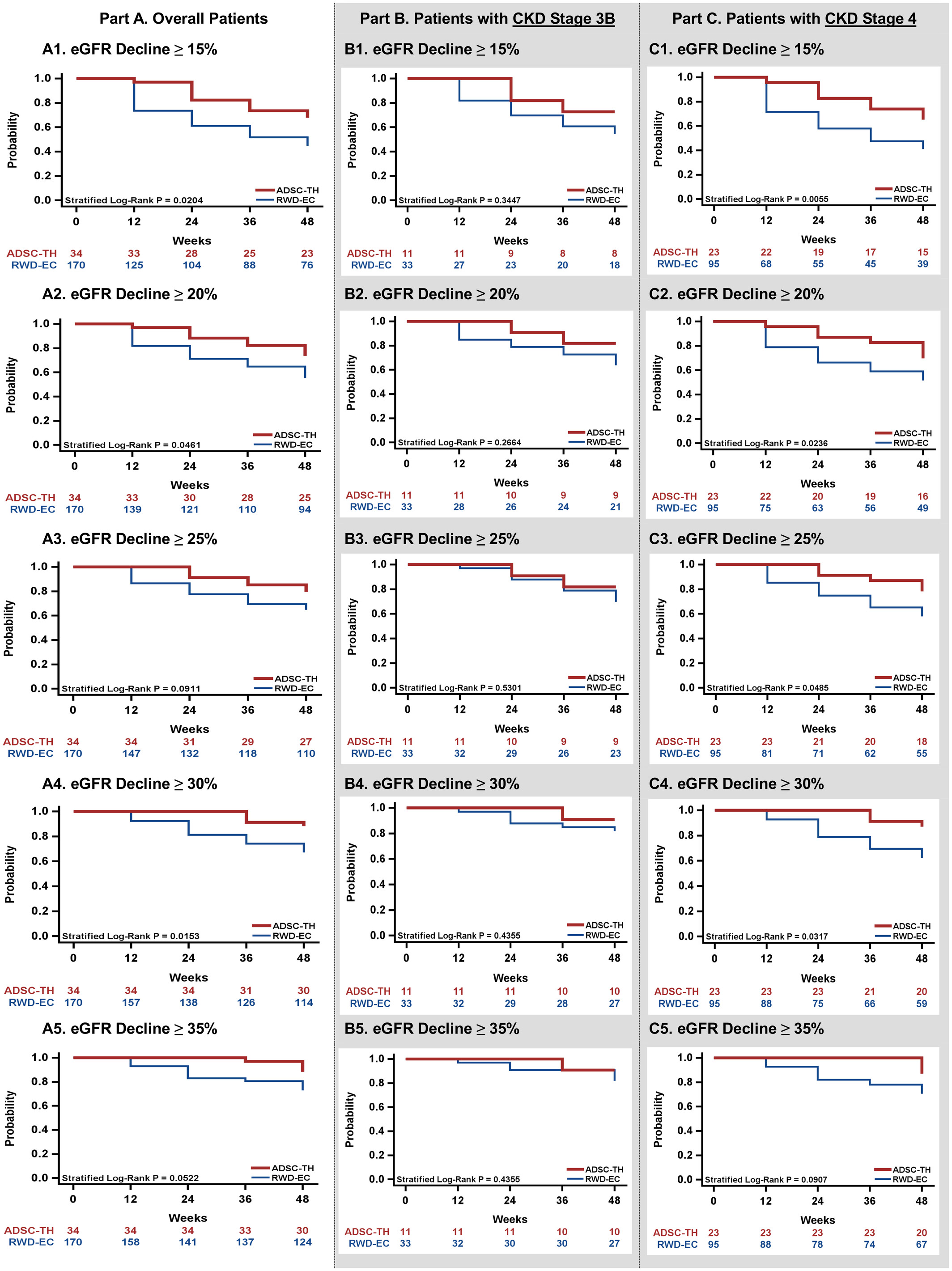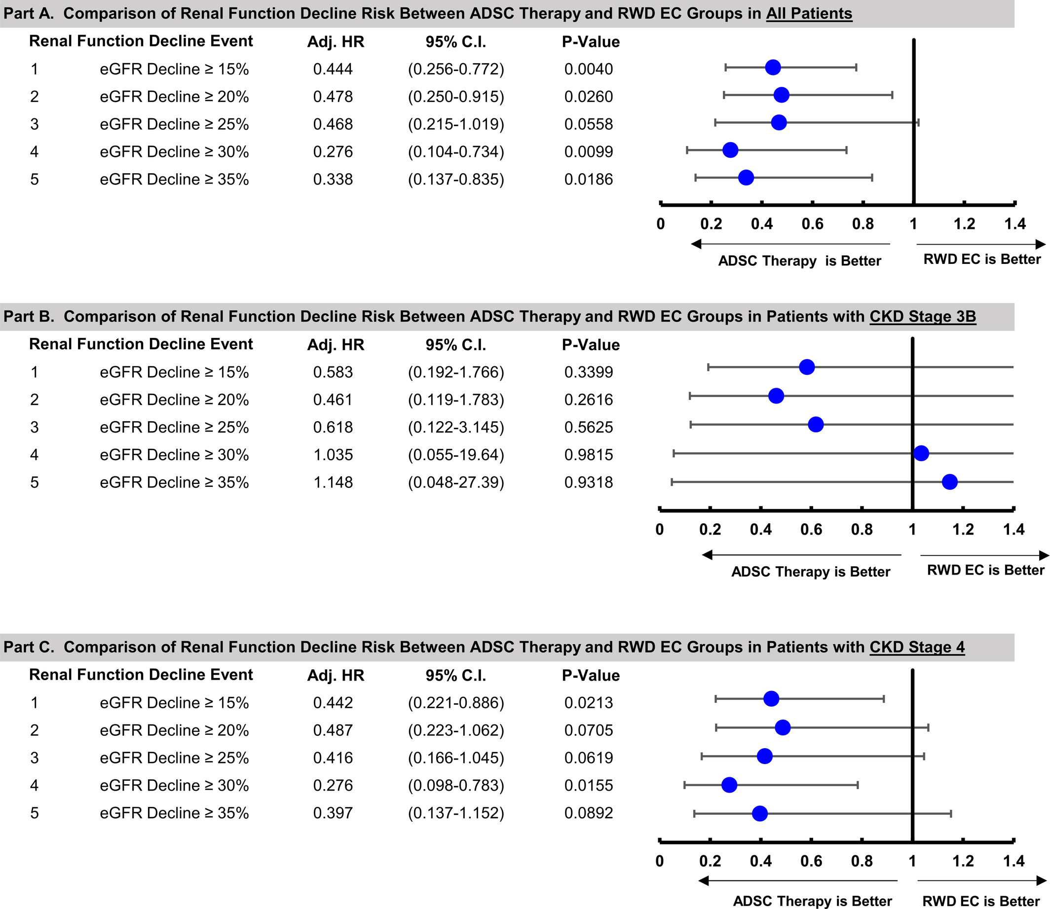 在ADSC治療組和RWD EC組中,我們?cè)u(píng)估了不同eGFR下降閾值下腎功能下降的風(fēng)險(xiǎn),并按總體人群、CKD 3B期和CKD 4期進(jìn)行分層(圖3)。
