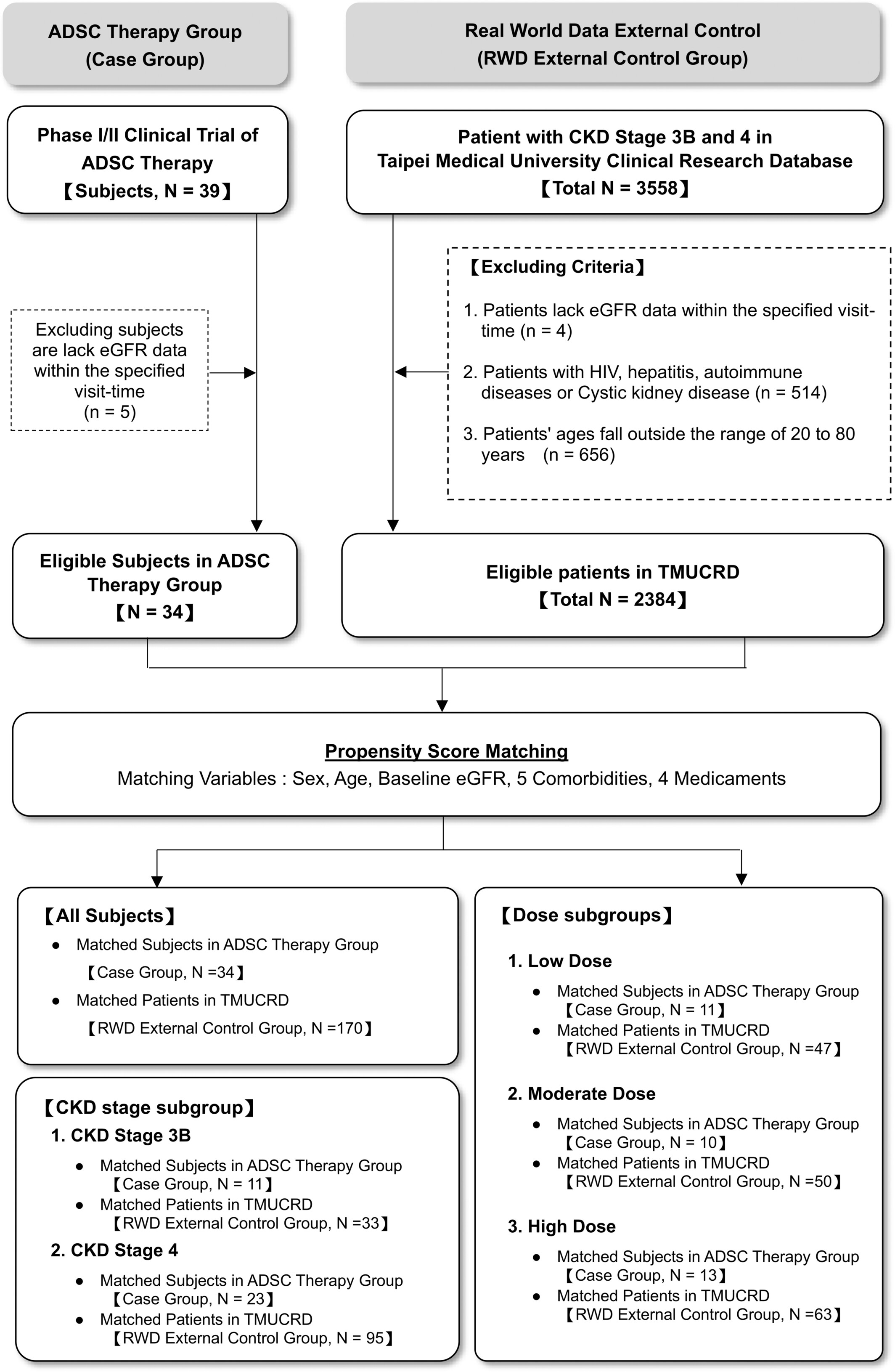 數(shù)據(jù)來源與研究對(duì)象:本研究數(shù)據(jù)源自一項(xiàng)評(píng)估異體ADSC療法(ELIXCYTE)的I/II期單臂臨床試驗(yàn)(共39名受試者,分低、中、高三個(gè)劑量組)以及臺(tái)北醫(yī)學(xué)大學(xué)臨床研究數(shù)據(jù)庫(TMUCRD)。