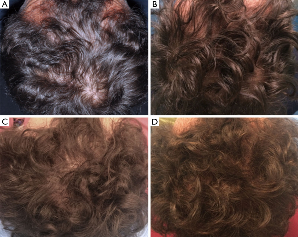 ▲45 歲男性吸煙者,雄激素性脫發,根據諾德伍德-漢密爾頓分級法分為 AGA 3 級。(A) T0 時的術前頭皮情況,頂葉、顳葉和額葉區域局部脫發;(B) 距上次治療 3 周后,T1 時的術后頭皮情況;(C) 距上次治療 9 周后,T2 時的術后頭皮情況;(D) 距上次治療 23 周后,T4 時的術后頭皮情況,頭發密度增加。