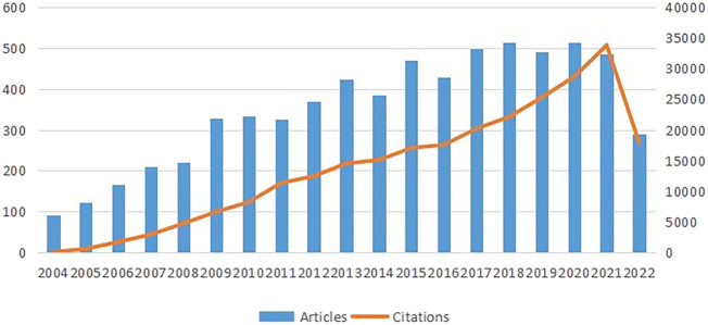 可以看出圖2,直方圖和曲線(xiàn)展示了兩個(gè)趨勢(shì):每年發(fā)表的論文總數(shù)和引用次數(shù)。這兩種趨勢(shì)隨著時(shí)間的推移而增長(zhǎng),說(shuō)明了該領(lǐng)域研究的發(fā)展方向。2004年至2021年間,引用次數(shù)顯著且迅速增加,表明干細(xì)胞在中風(fēng)中的研究引起了人們的興趣。2004年至2007年,文獻(xiàn)數(shù)量快速增長(zhǎng),2009年更是大幅增長(zhǎng)。不過(guò),2010年至2017年的文章數(shù)量保持相對(duì)穩(wěn)定。2020年是近年來(lái)發(fā)表數(shù)量最多的一年,峰值為515篇。雖然2022年的數(shù)據(jù)尚未完成,但預(yù)計(jì)將呈現(xiàn)出與上年相比,呈溫和趨勢(shì)。