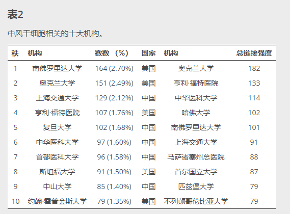 在中風(fēng)干細(xì)胞研究方面排名前三的國(guó)家是美國(guó)、中國(guó)和日本。排名前十的國(guó)家有四個(gè)歐洲國(guó)家、四個(gè)亞太國(guó)家和兩個(gè)美洲國(guó)家。此外,前10名的研究機(jī)構(gòu)中,有5家是美國(guó)的,其余5家是中國(guó)的。我們觀(guān)察到德國(guó)、日本、中國(guó)和美國(guó)這四個(gè)國(guó)家之間的密切配合。中國(guó)還積極與日本、加拿大和英國(guó)合作。上海交通大學(xué)、首都醫(yī)科大學(xué)、哈佛大學(xué)等學(xué)術(shù)機(jī)構(gòu)之間合作良好。盡管奧克蘭大學(xué)在論文發(fā)表方面排名第二,但人們發(fā)現(xiàn)它與其他大學(xué)的合作有限。這種合作對(duì)于這些大學(xué)的長(zhǎng)期學(xué)術(shù)進(jìn)步是有害的。因此,確實(shí)有必要多國(guó)研究機(jī)構(gòu)密切合作、交流,共同推動(dòng)中風(fēng)干細(xì)胞治療。