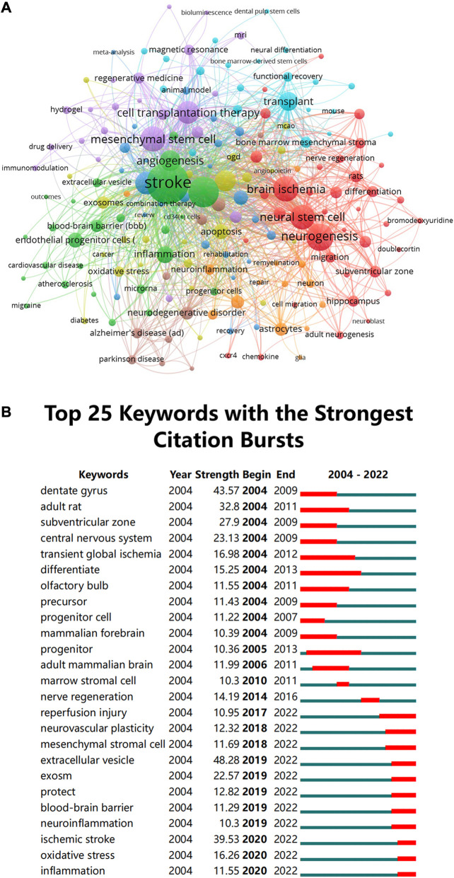圖5:(A)關(guān)鍵詞共現(xiàn)的聚類(lèi)。圖中的圓圈和標(biāo)簽構(gòu)成一個(gè)單元,不同顏色的單元構(gòu)成不同的簇(B)中風(fēng)干細(xì)胞相關(guān)引用爆發(fā)最強(qiáng)的前25個(gè)關(guān)鍵詞的CiteSpace可視化圖。