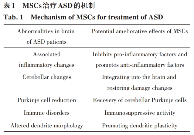 另有證據顯示,自閉癥受試者的小腦浦肯野細胞數量減少,而移植的間充質干細胞能夠促進突觸可塑性和功能恢復,并挽救小腦浦肯野細胞。MSCs針對ASD相關異常改變做出的潛在改善作用如表1所示。