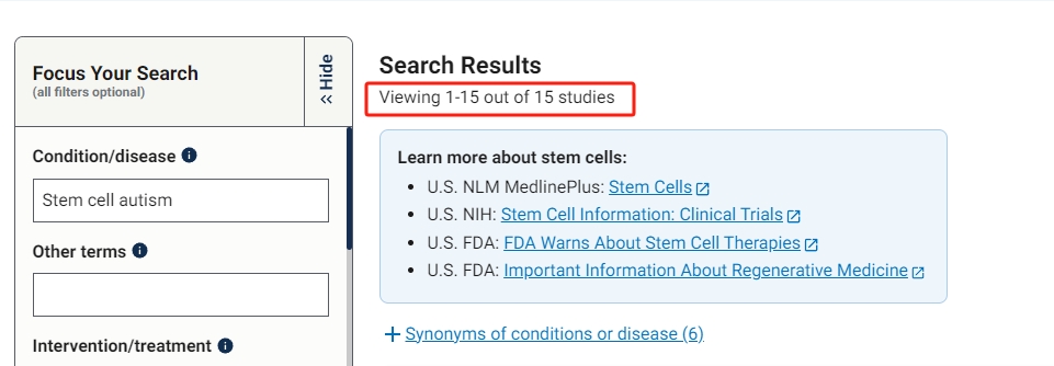 截止2023年11月,在美國國立衛生研究院的最大臨床試驗注冊庫clinicaltrials.gov網站上注冊的有關干細胞治療自閉癥的臨床研究項目有15項。