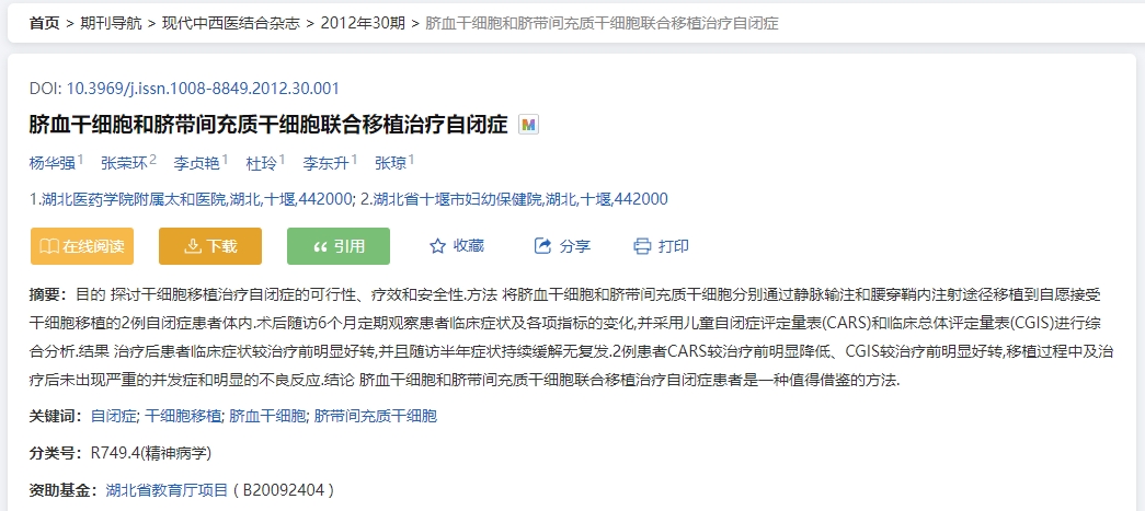 案例一:2010年,《中國組織工程研究與臨床康復》期刊雜志發表了一篇干細胞治療自閉癥:安全性和有效性觀察的臨床案例[1]。