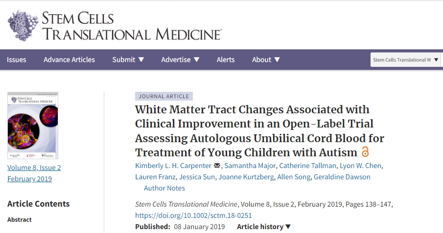 [3]:Kimberly LH Carpenter、Samantha Major、Catherine Tallman、Lyon W. Chen、Lauren Franz、Jessica Sun、Joanne Kurtzberg、Allen Song、Geraldine Dawson,白質束變化與評估自體臍帶血的開放標簽試驗中的臨床改善相關自閉癥幼兒的治療,干細胞轉化醫學,第 8 卷,第 2 期,2019 年 2 月,第 138–147 頁,https: //doi.org/10.1002/sctm.18-0251